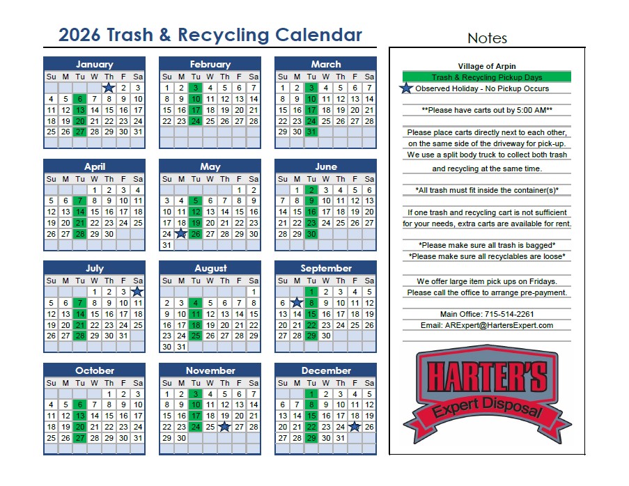 2026 Service Calendar Village of Arpin ยป